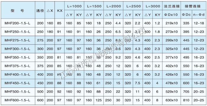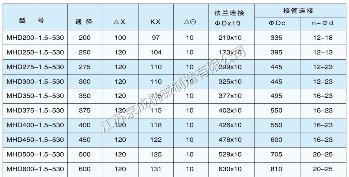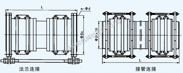 2、表中符號代表和技術(shù)參數(shù):△X:軸向補(bǔ)償量(mm); △θ:角向補(bǔ)償量(度); △Y:橫向補(bǔ)償量(mm);KX:軸向剛度(N/mm); Ky:橫向剛度(N/mm); L:產(chǎn)品總長(mm);ΦDx10:接管外徑x接管厚度(表中mm),產(chǎn)品為接管連接;ΦDc:連接孔分布的中心圓直徑; n-Φd:n為連接孔數(shù),Φd為連接孔徑,產(chǎn)品為法蘭連接;